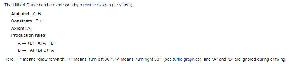 Having submitted my assignment, and having wanted to write a blog post about the subject – I started my search for a reasonable way to recursively draw the Hilbert curve. After all, this is a textbook example of a recursive process. Of course, as any realistic search goes, my first pit-stop was at Wikipedia to see if there is a recursive closed form functional equation to $f_n$. If I was able to find such a thing (and I am sure someone with infinite patience can figure it out if they set their mind to it) I would hit the jackpot because then all I really had to do was set up manim and tell the compiler what to do, and that was the less contrived bit. But when I went to Wikipedia and looked up the Hilbert curve, lo and behold, there was pseudo-code for generating the fractal! My day was getting better and better!